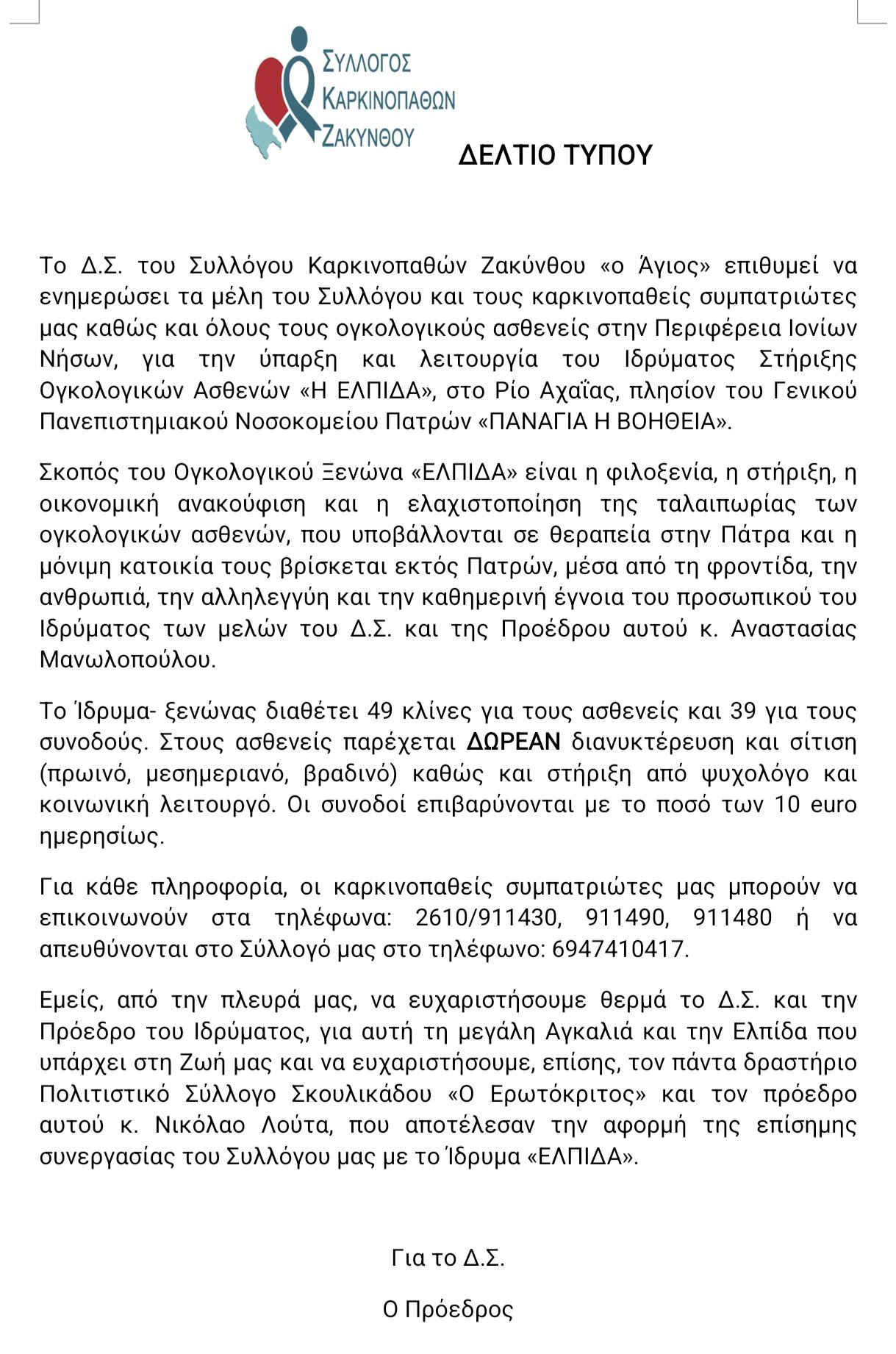 Στην ανακοίνωσή του, ο Σύλλογος, αναφέρει: «Το Δ.Σ. του Συλλόγου Καρκινοπαθών Ζακύνθου «ο Άγιος» επιθυμεί να ενημερώσει τα μέλη του Συλλόγου και τους καρκινοπαθείς συμπατριώτες μας καθώς και όλους τους ογκολογικούς ασθενείς στην Περιφέρεια Ιονίων Νήσων, για την ύπαρξη και λειτουργία του Ιδρύματος Στήριξης Ογκολογικών Ασθενών «Η ΕΛΠΙΔΑ», στο Ρίο Αχαΐας, πλησίον του Γενικού Πανεπιστημιακού Νοσοκομείου Πατρών «ΠΑΝΑΓΙΑ Η ΒΟΗΘΕΙΑ».